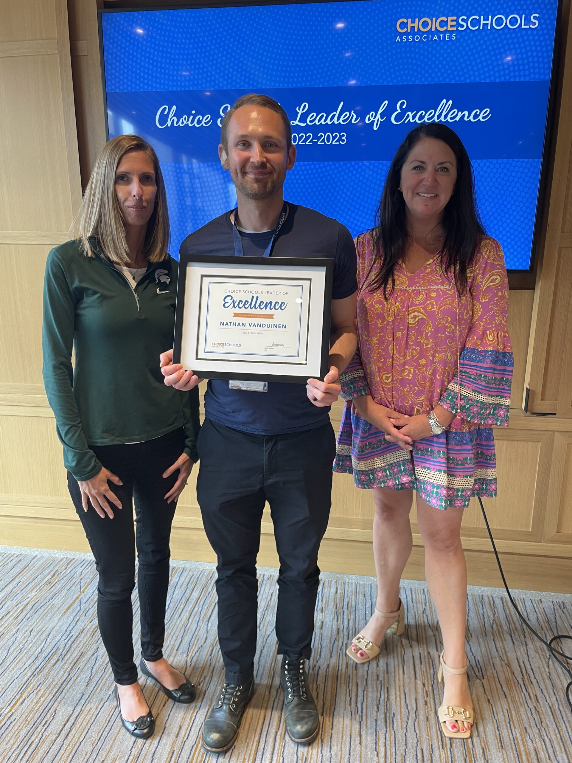 Every year, Choice Schools awards the Choice Leader of Excellence of the Year to one school leader in our network based on nominations from school staff and other school leaders in the Choice Schools organization. This year, the school leadership team selected Nate!