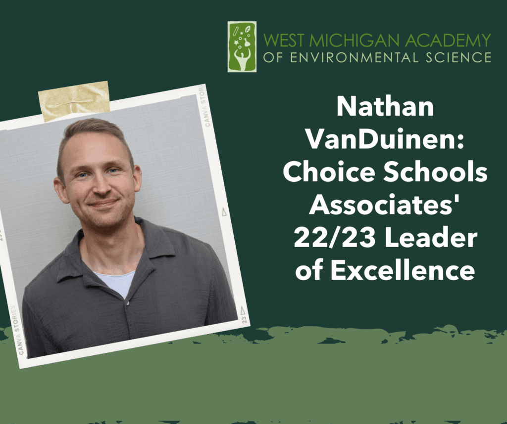Choice Schools is pleased to announce the 22/23 Choice Leader of Excellence of the Year, Mr. Nate VanDuinen. Nate is the elementary principal at West Michigan Academy of Environmental Science in Grand Rapids, MI, a premier charter school in the area.